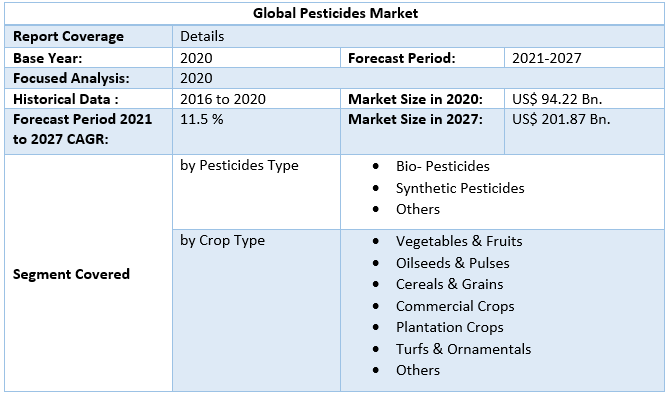 Pesticides Market size size was valued at US $ 94.22 Bn. in 2020 and the total revenue is expected to grow at 11.5 % through 2021 to 2027, the Pesticides market is reaching nearly US $ 201.87 Bn in 2027.